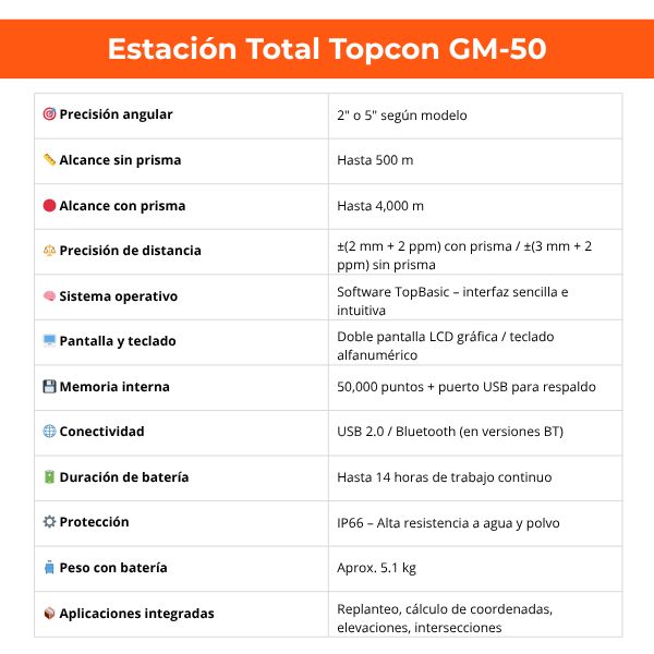 La NUEVA estacion total Topcon GM-50 es la herramienta perfecta de levantamiento y replanteo de nivel básico que ofrece fiabilidad y flexibilidad sin sacrificar costes ni funcionalidad.