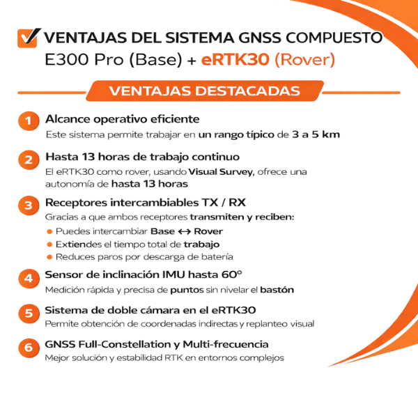 El sistema eSurvey E300 Pro + eRTK30 ofrece una solución profesional Base + Rover que combina rendimiento, conectividad y medición visual avanzada.